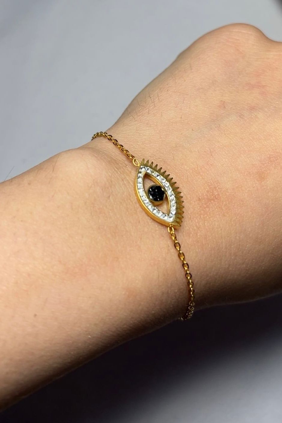 L’Œil de Minuit est un bracelet fin et raffiné, orné d’un œil mystique au centre noir profond, encerclé d’un éclat délicat de strass diamantés. Tel un talisman nocturne, il incarne protection, élégance et mystère