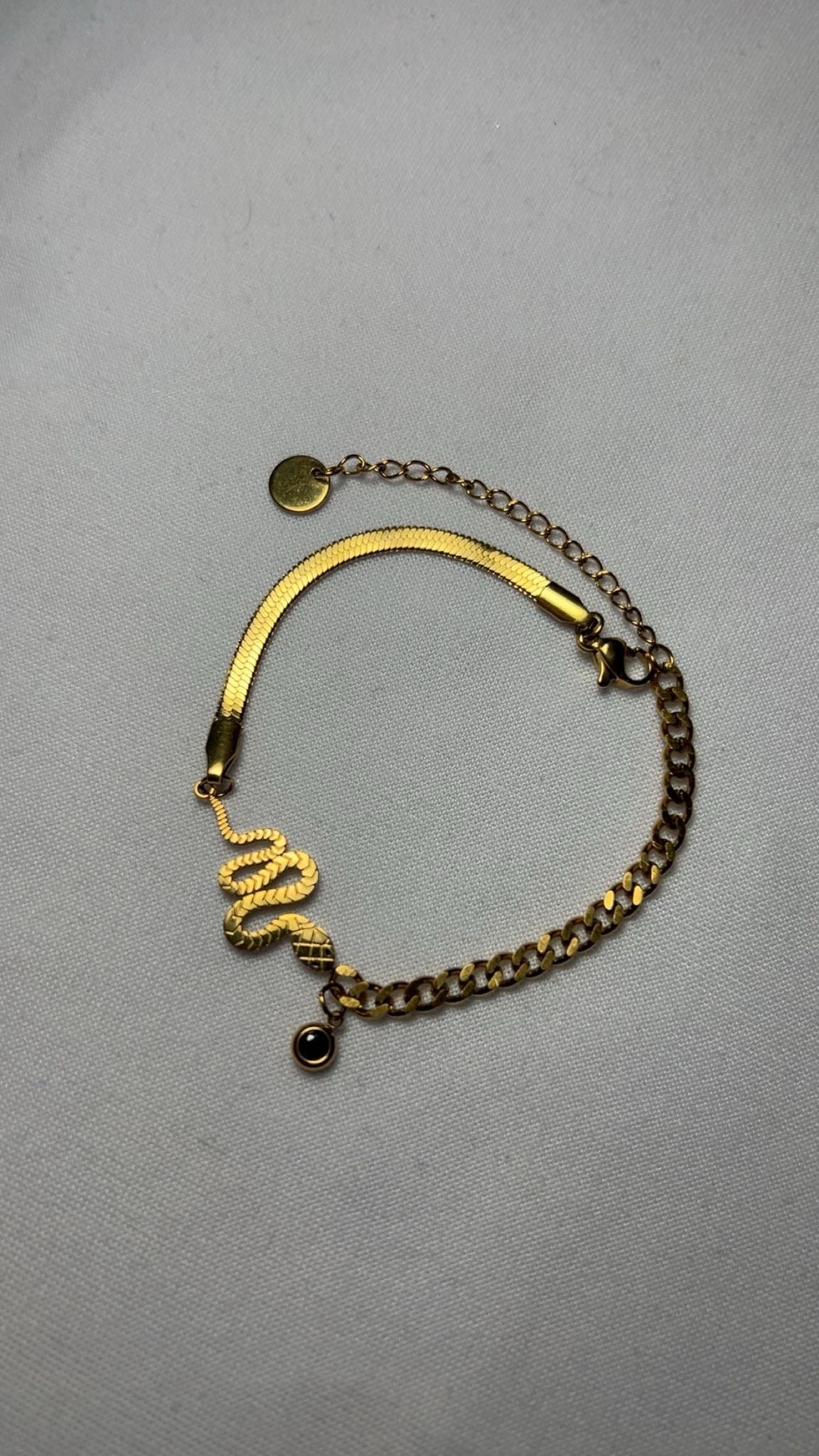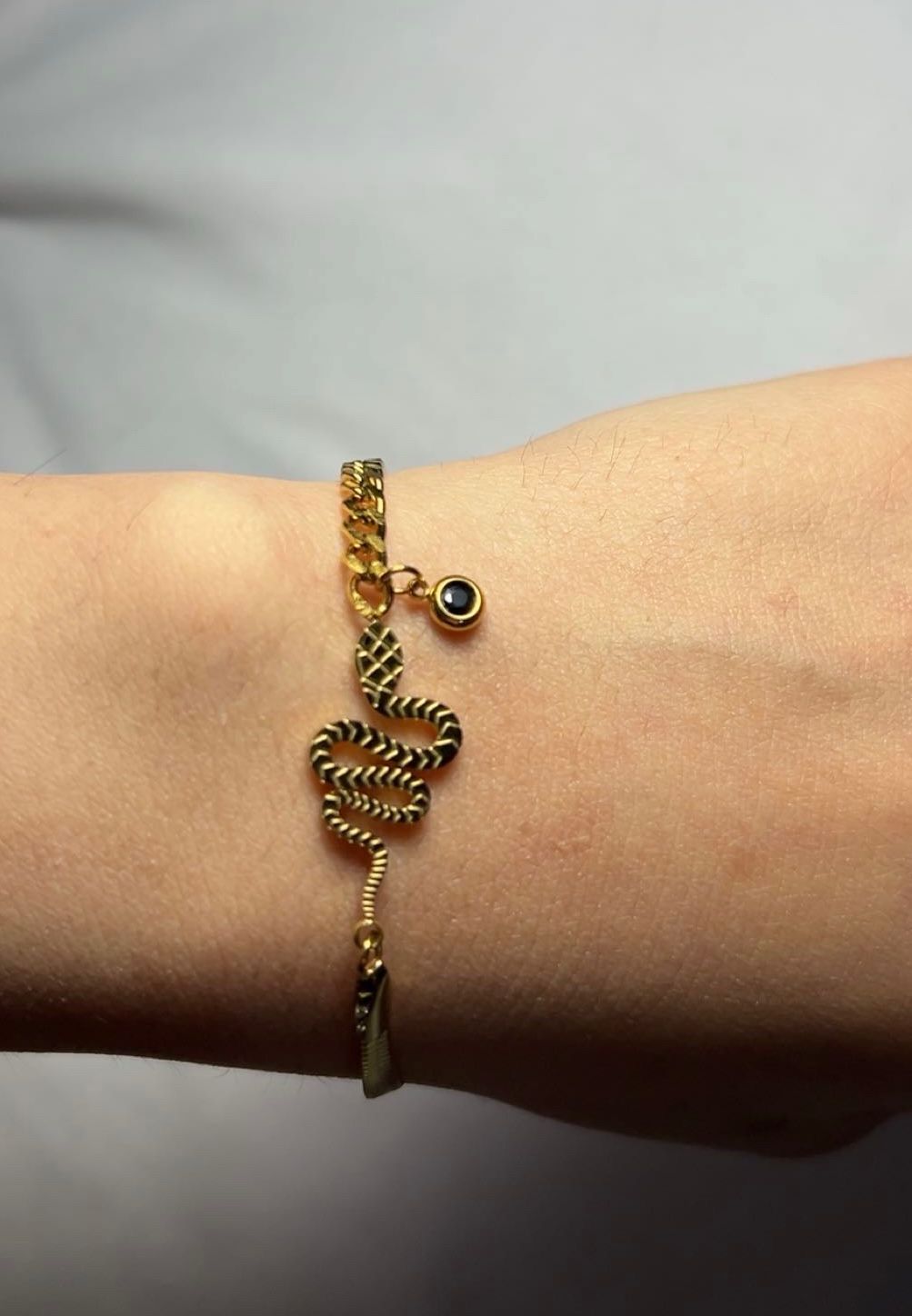 Noir Élégance incarne le raffinement absolu dans un bijou au charme envoûtant. Ce bracelet fin mêle la silhouette sinueuse d’un serpent à la profondeur mystérieuse d’une perle noire, symbole de puissance et de féminité. Un accessoire sophistiqué qui sublime votre poignet avec une touche de mystère et une élégance intemporelle